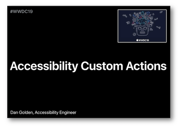 This video available on the official Apple website (session 250) highlights the custom actions for the screen reader and the Switch Control feature thanks to a demo application that presents the explained concepts.