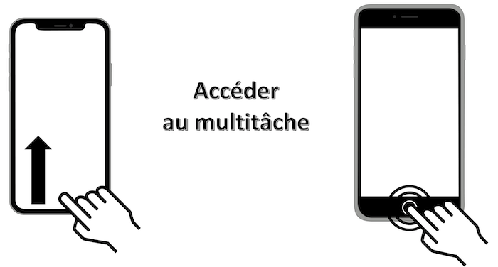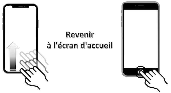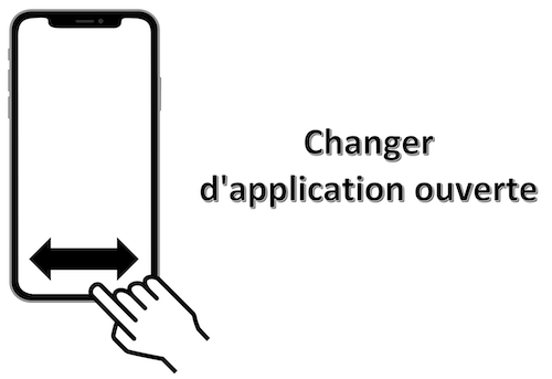 Mouvement : glissement avec 1 doigt vers la gauche ou la droite dans la limite la plus basse de l'écran correspondant à la barre d'accueil de l'application ouverte.