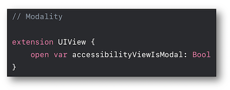La solution consiste à modifier accessibilityViewIsModal de façon à ce que VoiceOver n'analyse que les éléments de la vue mise en avant.